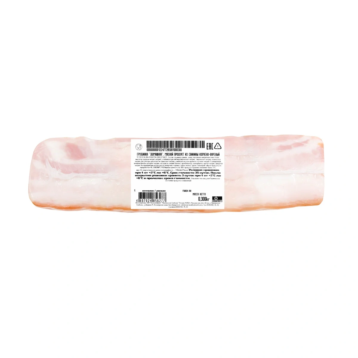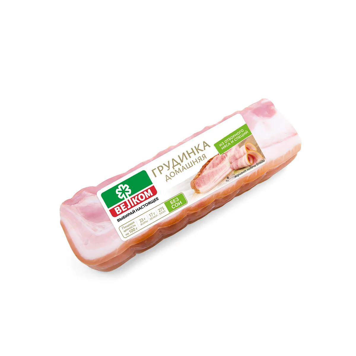 Имеет исключительно нежный вкус и аромат. Сочная мясная грудинка с тонкими прослойками шпика - идеальная холодная закуска к вашему столу.