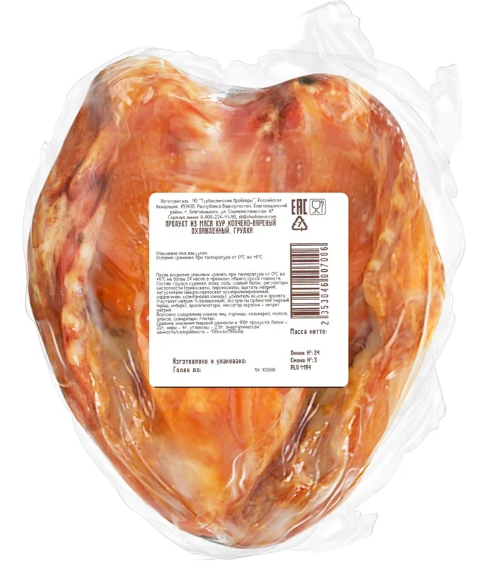 Обладает плотной структурой, гармоничным вкусом и приятным ароматом. Упругое мясо удобно режется, поэтому оно превосходно подойдет для бутербродов, сэндвичей, салатов и пиццы. В меру соленый и низкокалорийный продукт идеально впишется в диетическое меню.