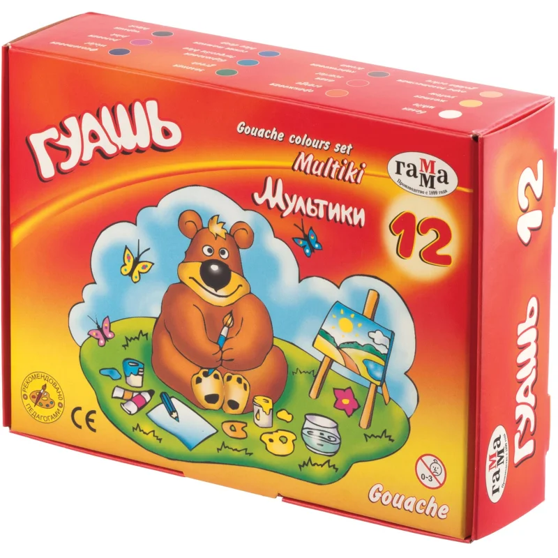 Набор гуаши ГАММА «Мультики» разработан совместно с педагогами специально для детей школьного возраста от 6 до 9 лет. Краска производится на основе качественного прозрачного связующего вещества, которое обеспечивает чистоту цветов. Краски плотные, укрывистые, хорошо смешиваются, равномерно наносятся практически на любую основу. При высыхании создают плотный красочный слой с бархатистым эффектом. Цветовая палитра гуаши данной серии состоит из 12 классических оттенков краски (белый, жёлтый, охра золотистая, оранжевый, алый, коричневый, фиолетовый, розовый, чёрный). Гуашь фасуется в пластиковые герметичные баночки с логотипом на крышке. Объём одной баночки — 20 мл. Общий объём — 240 мл.