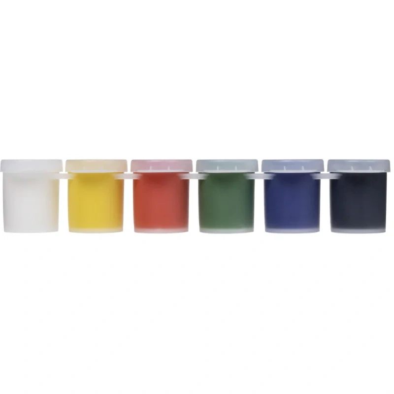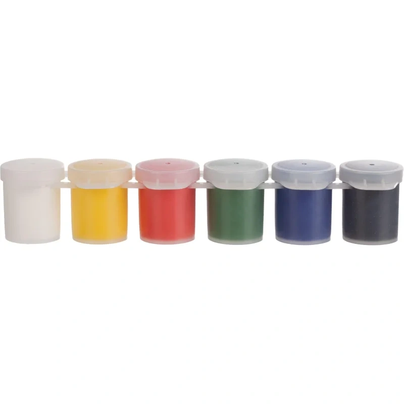 Предназначена для творчества детей, при необходимости разбавляется водой, безвредна, быстро высыхает, легко смывается с рук и одежды. Краски изготовлены на основе натуральных компонентов и высококачественных пигментов. Обладают хорошей кроющей способностью и чистотой цвета. В набор входит 6 цветов: белила титановые, желтый светлый, алый, зеленый светлый, синий светлый, черный. Краски упакованы в цветную картонную коробку, размер упаковки (ДxШxВ): 207×47×38 мм. Объем одной баночки — 15 мл. Поставляется без кисти. Законодательные и технические документы.