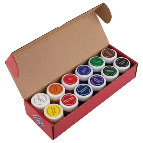 В набор входят следующие цвета: белила цинковые, желтая светлая, охра золотистая, краплак красный, красная, лазурь железная, ультрамарин, фиолетовая темная, ярко-зеленая, зеленая темная, умбра жженая, сажа газовая.
