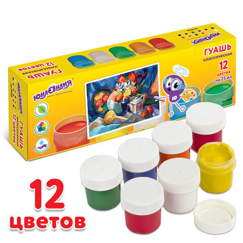 Гуашь ЮНЛАНДИЯ 'ЮНЛАНДИК-ХУДОЖНИК', 12 цветов по 25 мл, без кисти, картонная коробка, 191535