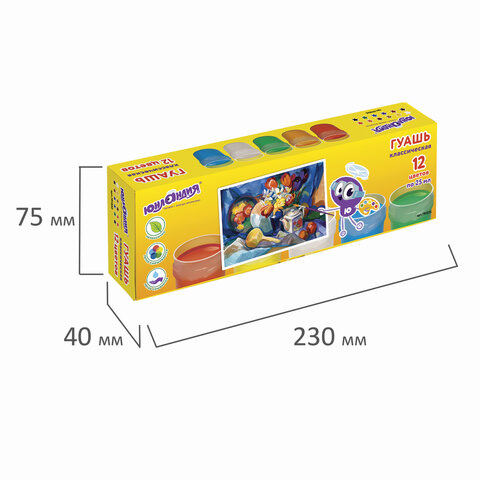 12 ярких сочных цветов красок полностью безопасны в использовании, не токсичны и не имеют резкого запаха. Гуашь имеет высокую светостойкость и укрывистость, легко размывается водой, хорошо наносится, без труда удаляется с рук и одежды. Краска находится в пластмассовой герметичной баночке, объем которой равен 25 мл. Общий объем - 300 мл.