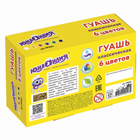 Гуашь ЮНЛАНДИЯ 'ЮНЛАНДИК-ХУДОЖНИК', 6 цветов по 25 мл, без кисти, картонная коробка, 191534