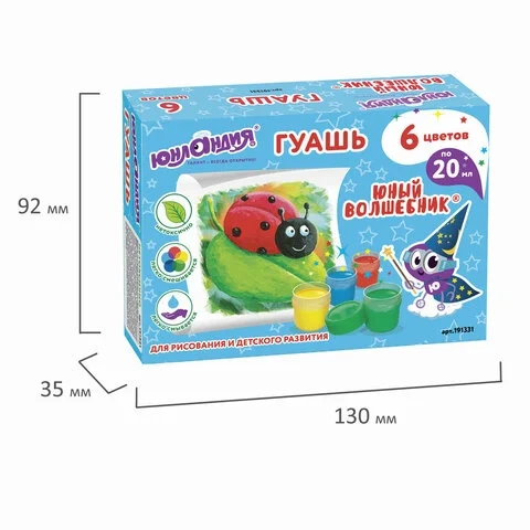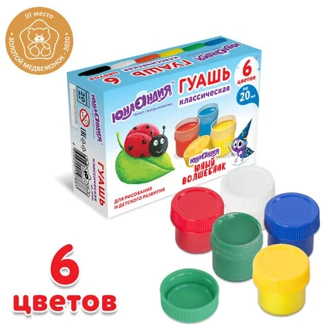 Гуашь ЮНЛАНДИЯ 'ЮНЫЙ ВОЛШЕБНИК', 6 цветов по 20 мл, высшее качество, без кисти, картонная упаковка,