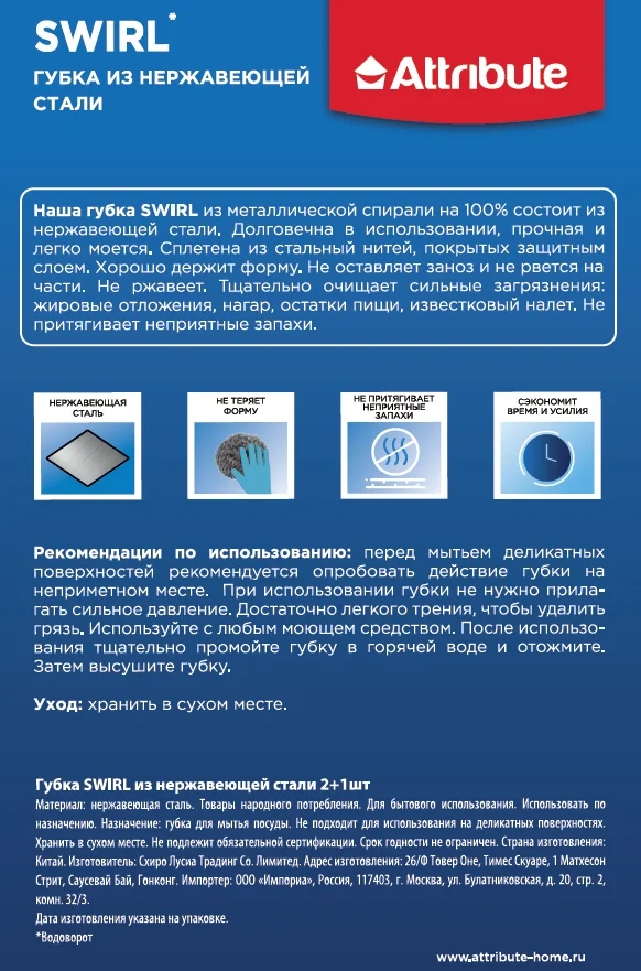 Губка Attribute Swirl из нержавеющей стали, 2+1шт