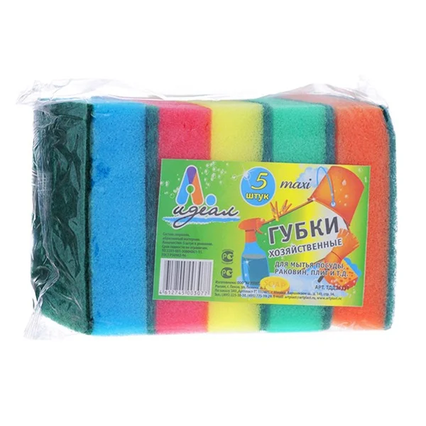 Набор Идеал 'Maxi', изготовленный из мягкого поролона с абразивными материалами, состоит из 5 губок. Губки предназначены для уборки и мытья посуды. Они идеально удаляют жир, грязь и пригоревшую пищу.