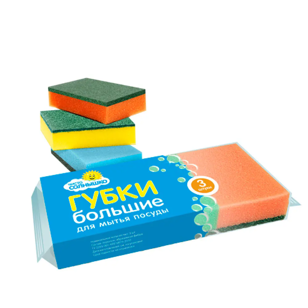 Губка для посуды Чисто Солнышко поролоновая с абразивом, профильная, пачка 3 шт.Размер: 80х63х40 мм.Цвет: в ассортименте.В индивидуальной упаковке.