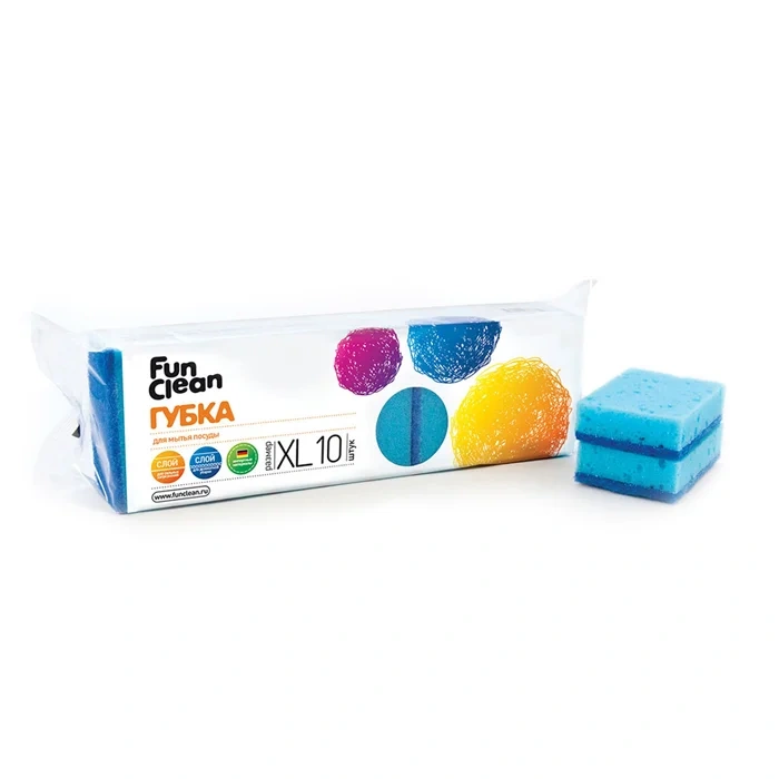 Fun Clean предлагает губки для мытья посуды, которые не только прекрасно борются с обычными загрязнениями, но и легко справляются с пригоревшими остатками пищи при этом не повреждая даже такие деликатные поверхности, как эмаль и тефлон.
