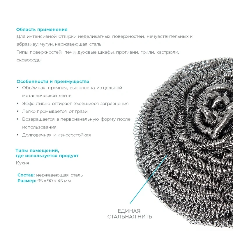 Износостойкая и долговечная, высокоэффективная металлическая губка для оттирки сильных въевшихся загрязнений. Не ржавеет. Объемная, прочная, выполнена из цельной металлической ленты.