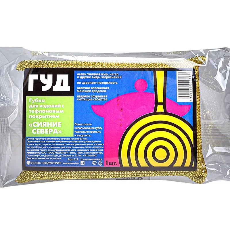 Губка для посуды Сияние Севера поролоновая в оплетке для изделий с тефлоновым покрытием.Размер: 110х80х25 мм.Цвет: в ассортименте.В индивидуальной упаковке.