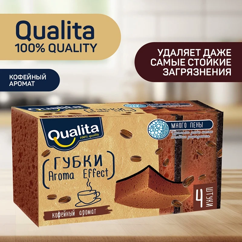 Губка Qualita Aroma Effect для посуды, 4 шт. представляют собой незаменимых помощников в ежедневных задачах по уборке и мытью посуды. Изделие идеально подходит для чистки кафеля, сантехники, стекла, керамики и других поверхностей. Губки легко впитывают влагу, предотвращая появление потенциальных повреждений и царапин. Благодаря структуре поролона губка быстро вспенивается, долго сохраняет форму. Приятный аромат кофе, интегрированный в структуру поролона, создает дополнительный комфорт при использовании. Уход за губками невероятно прост. После использования рекомендуется промыть их в теплой воде с добавлением мягкого моющего средства. Затем тщательно выжать излишек влаги. Губки поставляются в удобной упаковке, включающей две штуки, что обеспечивает их долгосрочное использование без необходимости частой замены. В упаковке 4 губки насыщенного кофейного оттенка.