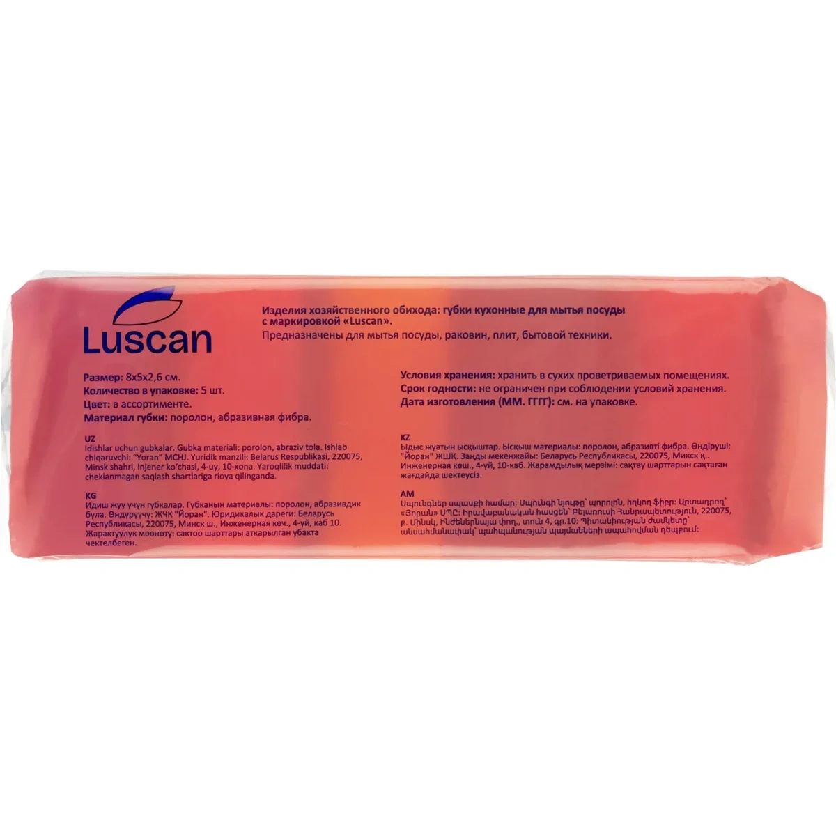 Губка Luscan используется для мойки раковин, посуды, плит. Изготовлена из поролона, разрешённого для чистки поверхностей, контактирующих с пищей. Поролон хорошо держит пену, абразивный слой эффективно борется с сильными загрязнениями. Абразивный полимер и полиуретан, которые используются для изготовления, выдерживают износ и температурные воздействия. Губка имеет прямоугольную форму и небольшую толщину, она комфортно располагается в руке и не вызывает дискомфорта при продолжительном мытье посуды.