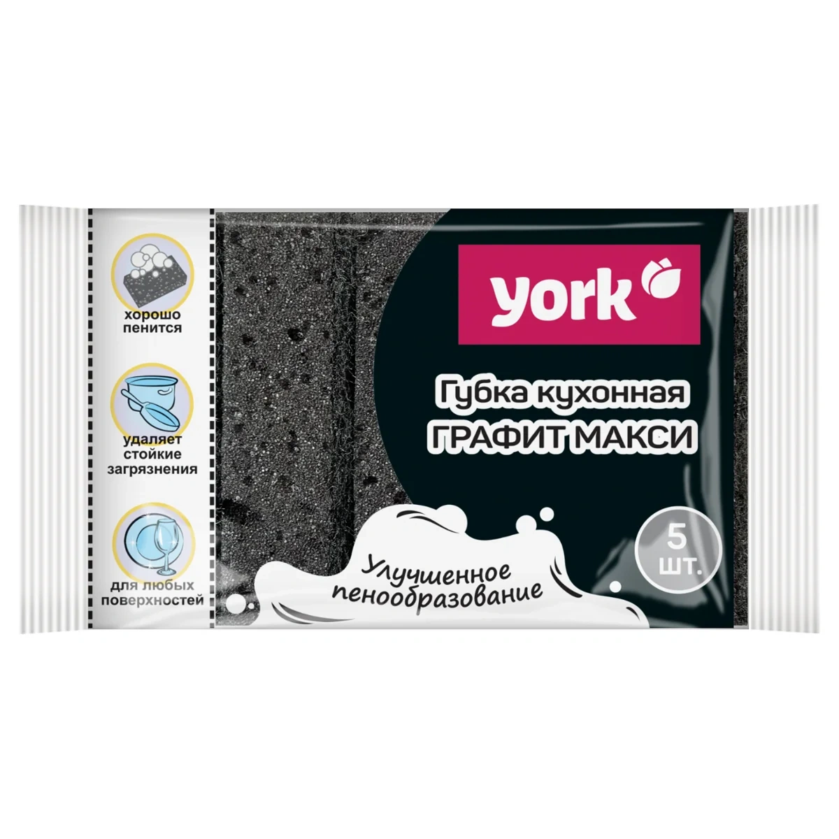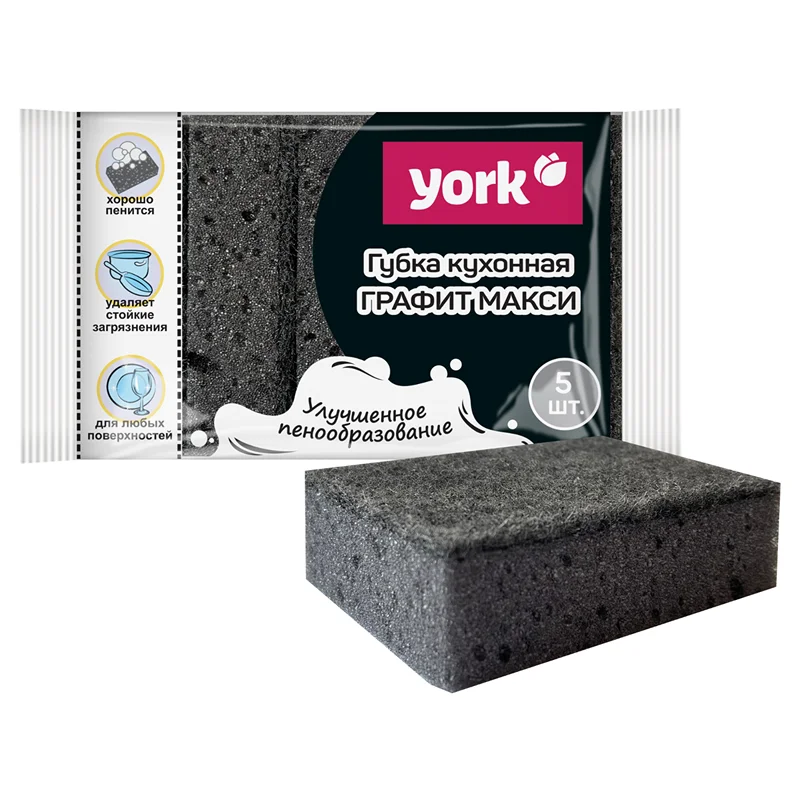 Губки для посуды York 'Графит Макси', поролон с абразивным слоем, 9,5*6,5*3 см, 5шт.