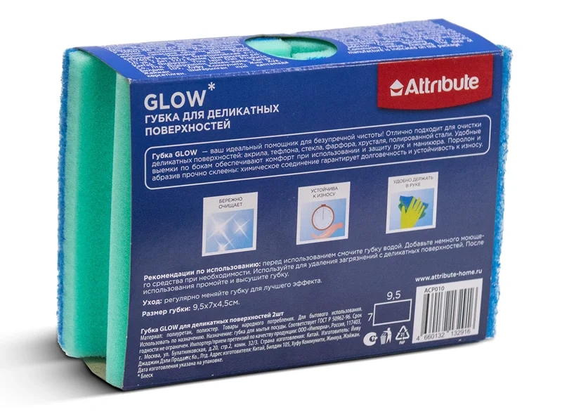 Губка для деликатных поверхностей Attribute Glow 9.5 x 7см, 2шт