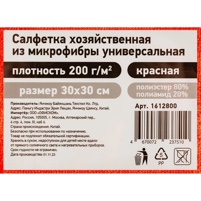 Салфетка хозяйственная из микрофибры универс 200г/м2 30х30см красн