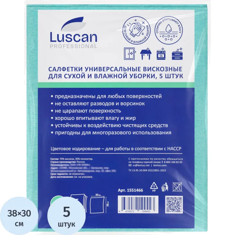 Салфетки хозяйственные Luscan Professional виск 90г/м2 30х38 5шт/уп зеленые