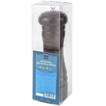 METRO PROFESSIONAL Мельница темное дерево, 19 см используется для измельчения перца, крупной соли и других специй. Опытные повара предпочитают именно такой способ, а не готовые приправы. Свежемолотые специи обладают особым вкусом и ароматом. Так можно контролировать состав и создавать собственные комбинации приправ. Для измельчения достаточно несколько раз повернуть крышку. Готовый продукт с нужной фракцией высыпается из специальных отверстий на дне. Мельница изготовлена из безопасных для человека материалов. Они не влияют на вкусовые качества продуктов, помещенных внутрь, не впитывают запахи и не выделяют опасных и токсичных веществ при контакте со специями. Ухаживать за изделием легко. При соблюдении правил эксплуатации и ухода, указанных производителем, оно прослужит долгие годы.