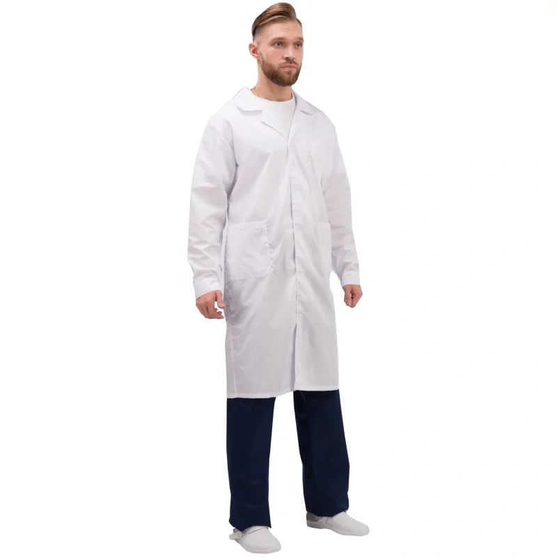 Модель прямого кроя со свободным силуэтом обеспечивает комфорт при движении. Халат застегивается на пуговицы по центральному шву. Длинные рукава с прямыми манжетами дополнены отложным воротником классического кроя. Для удобства использования предусмотрены два вместительных боковых накладных кармана.