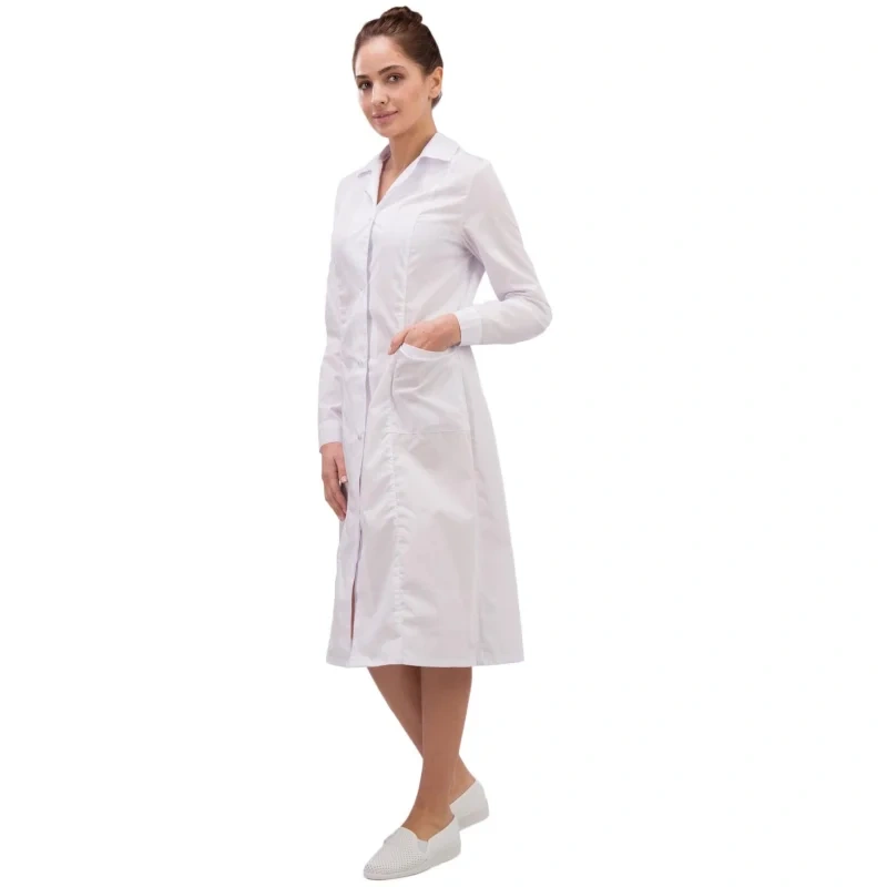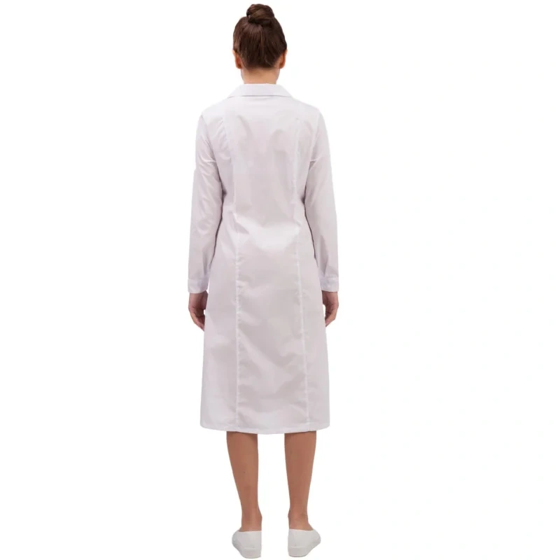 Модель прямого кроя со свободным силуэтом, что обеспечивает комфорт при движении. Халат застёгивается на пуговицы по центральному шву. Длинные рукава с прямыми манжетами дополнены отложным воротником классического кроя. Для удобства использования предусмотрены два вместительных боковых накладных кармана.