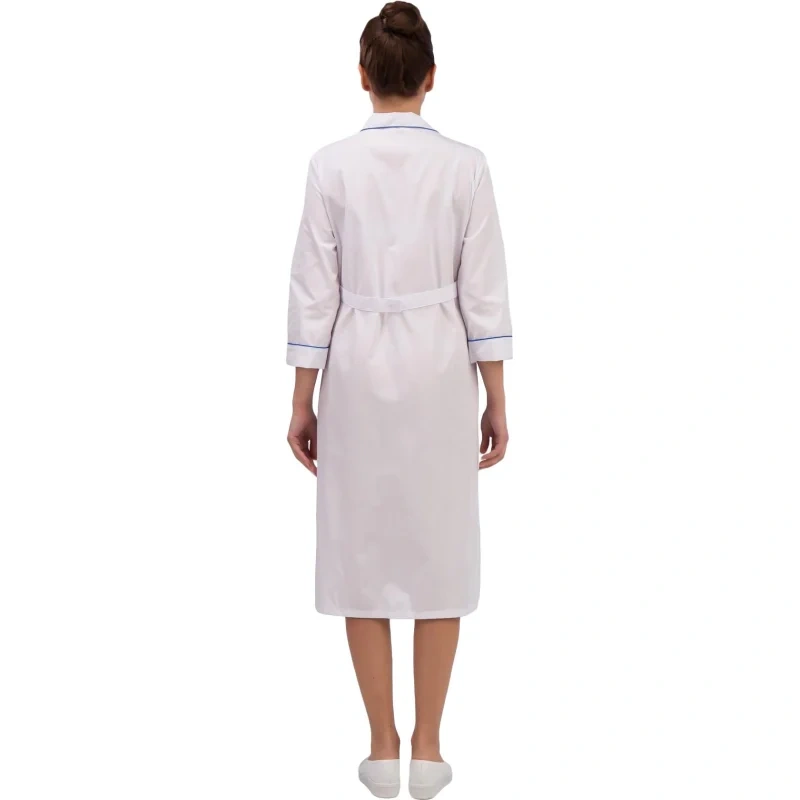 Халат имеет полуприлегающий силуэт с центральной застёжкой на пуговицы. Отложной воротник и рукава 3/4 обеспечивают комфорт при носке. Два нижних накладных кармана позволяют удобно хранить необходимые мелочи. Внутренний карман с нашивкой ФИОЛ отсутствует.