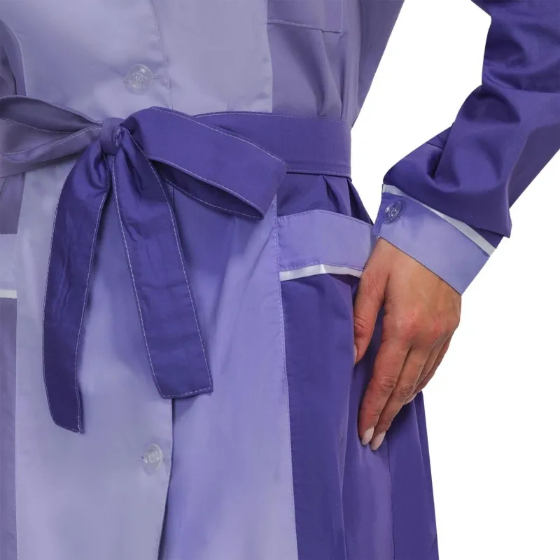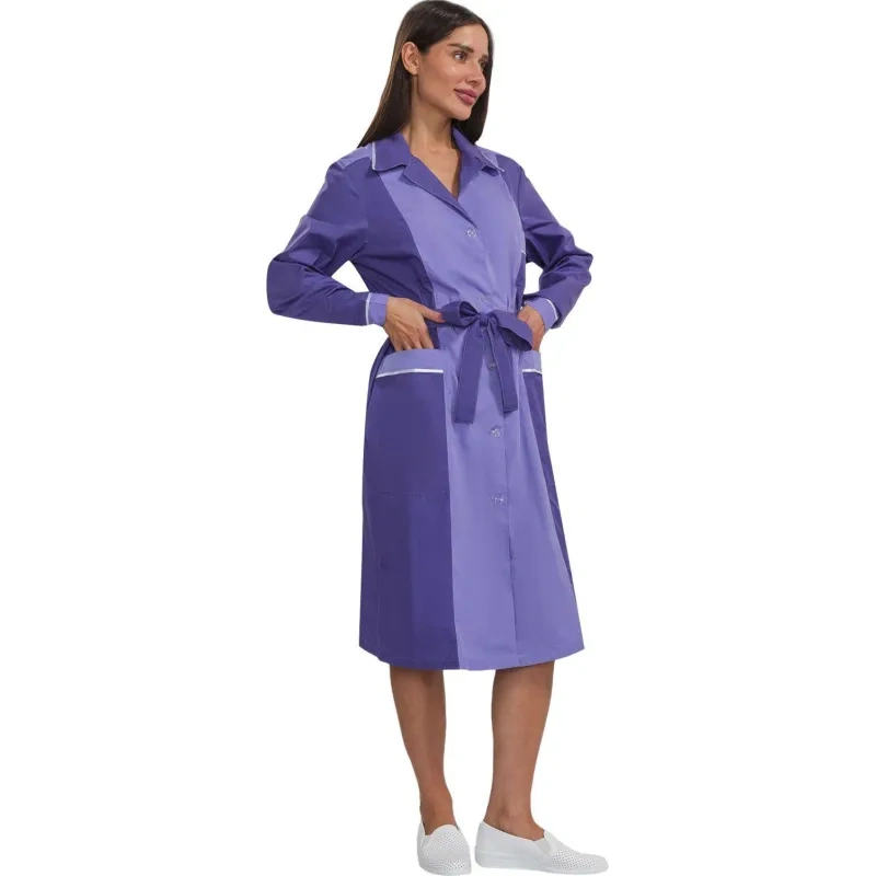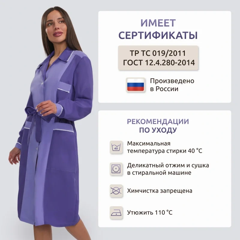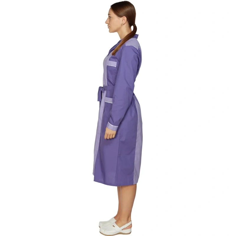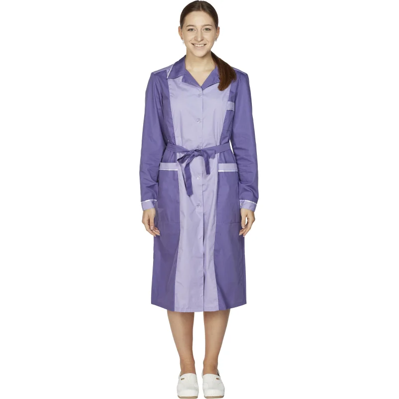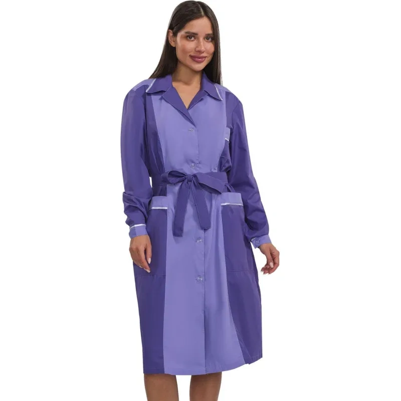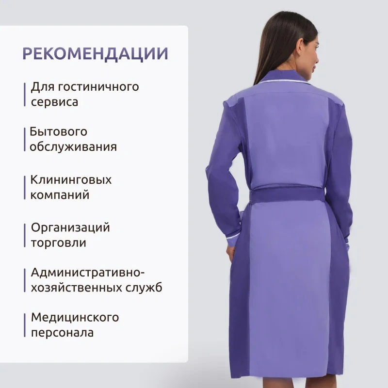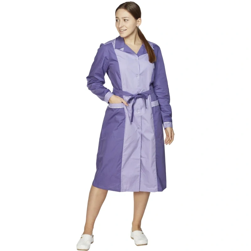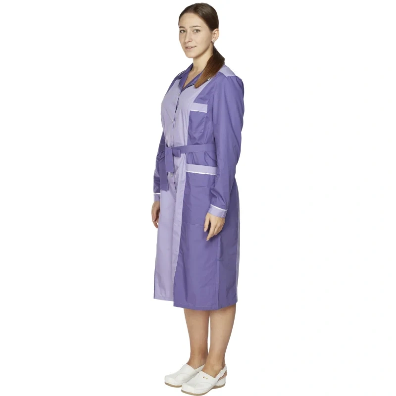 Женский халат для горничных и уборщиц У09-ХЛ, размер 48-50, рост 158-164. Цвет: фиолетовый со светло-сиреневой и белой отделкой. Халат полуприлегающего силуэта, длиной ниже колен. Застежка на петли и пуговицы. Стильный и элегантный халат с английским воротником, рукав длинный, с манжетой, карманы накладные, пояс вокруг талии. Халат изготовлен из смесовой ткани Ти-Си, состав - 65% полиэфира и 35% хлопка. Ти-Си - материал, приятный на ощупь, гигиеничен и долговечен. Не мнется, легко и быстро стирается, быстро сохнет. Долго сохраняет свой первоначальный яркий цвет. Ткань дышит, благодаря входящему в состав хлопку, имеет повышенный срок службы и проста в уходе, благодаря полиэфиру. Плотность ткани 115 г/м квадратный. Униформа рекомендована для сферы обслуживания, клининга, гостиничного бизнеса.