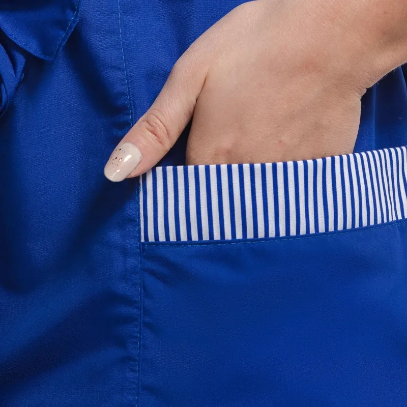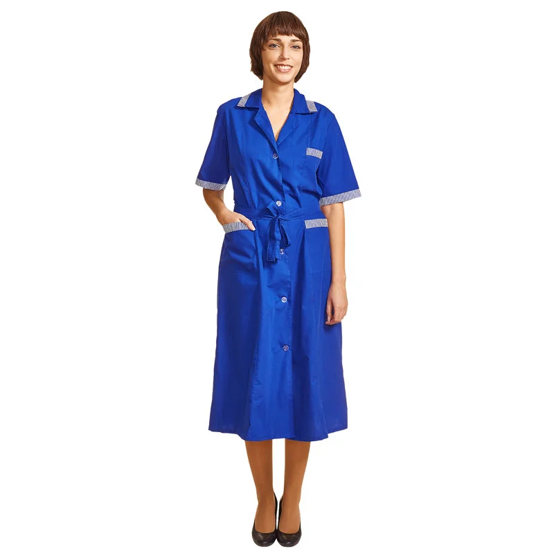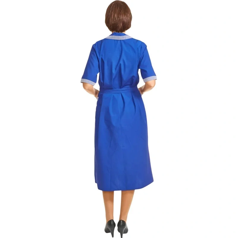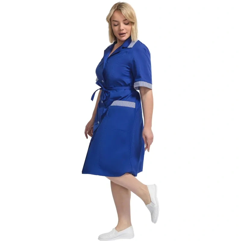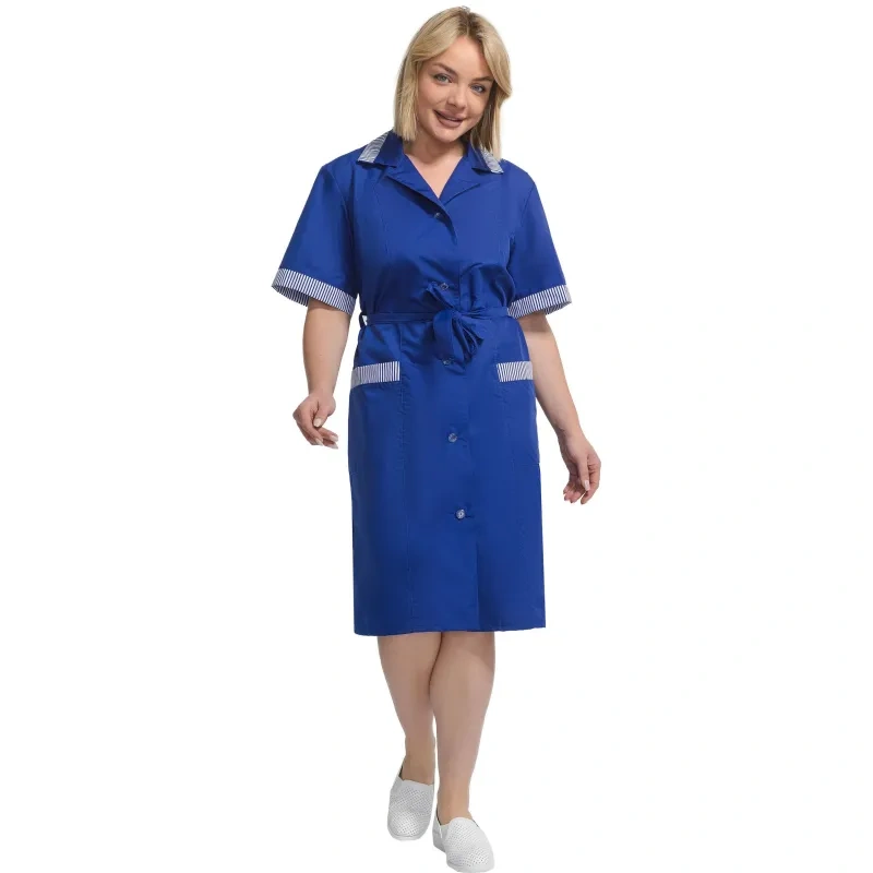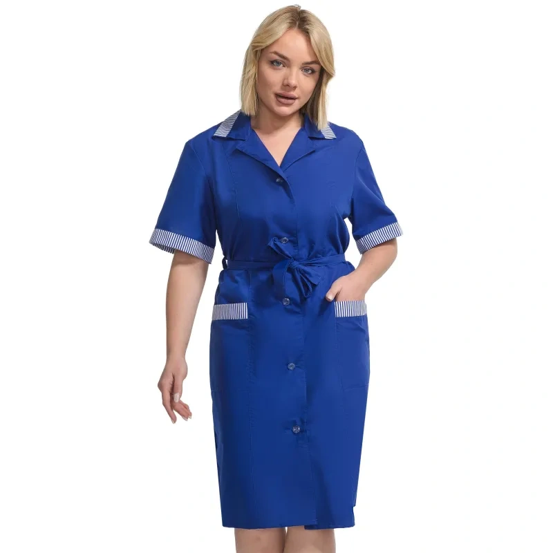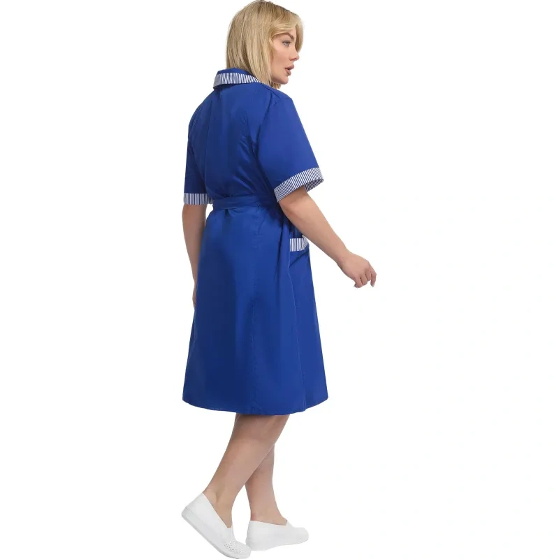 Женский халат для горничных и уборщиц у01-ХЛ размер 52-54, рост 170-176 см. Изготовлен из смесовой ткани Ти-Си, цвет васильковый (ярко-синий), состав — 65% полиэфира и 35% хлопка (плотность ткани 120 г/кв.м.). Ти-Си — материал, приятный на ощупь, гигиеничен и долговечен. Не мнется, легко и быстро стирается, быстро сохнет. Долго сохраняет свой первоначальный яркий цвет. Ткань «дышит», благодаря входящему в состав хлопку, имеет повышенный срок службы и проста в уходе, благодаря полиэфиру. Рукав короткий. Воротник отложной с лацканами, есть накладные карманы. Отлет воротника, верхние части карманов и края рукавов отделаны светлой тканью. Халат застегивается на пуговицы. Униформа рекомендована для сферы обслуживания, клининга, гостиничного бизнеса.