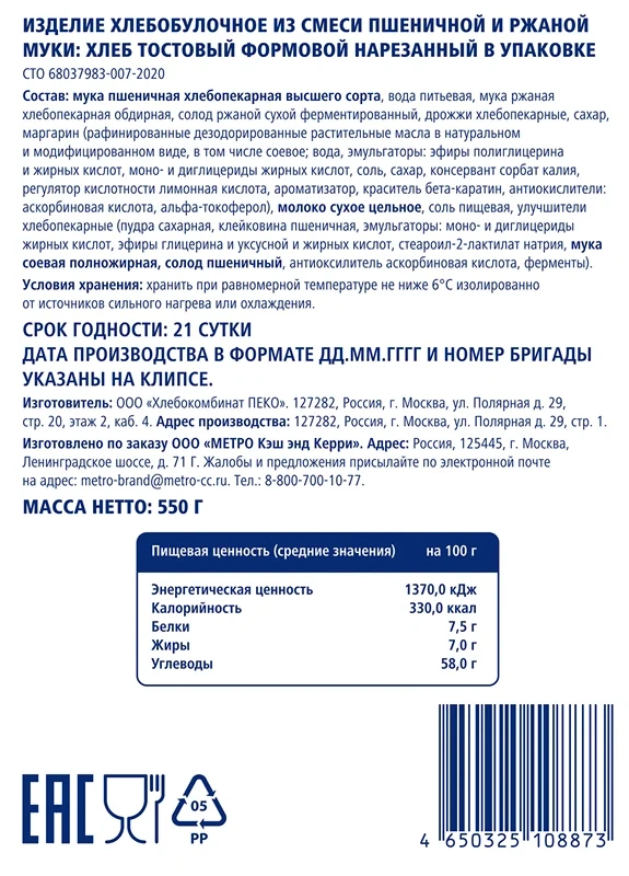 METRO Chef Хлеб тостовый ржано-пшеничный нарезка, 550г