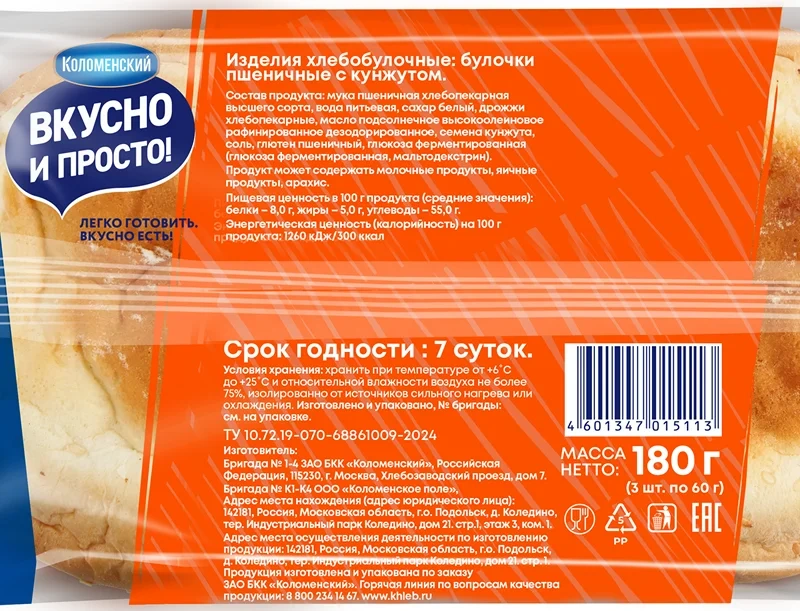 Булочки для хот-догов Коломенский (60г х 3шт), 180г
