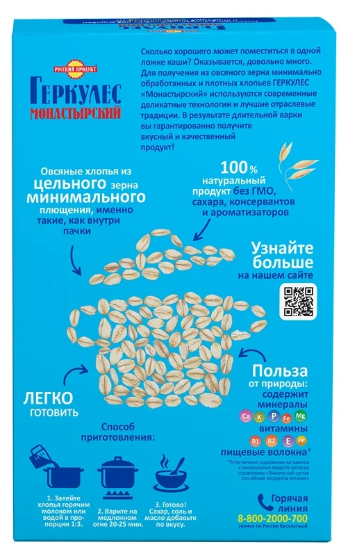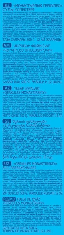 Геркулес Монастырский овсяные хлопья минимального плющения, в которых сохраняется максимум полезных микроэлементов и витаминов, содержащихся в цельном зерне. Именно такие хлопья православные монахи использовали для приготовления блюд во время Поста. Стакан хлопьев залить 0,6 л (3 стакана) горячей воды, довести до кипения и варить на слабом огне при помешивании 20-25 минут до загустения.