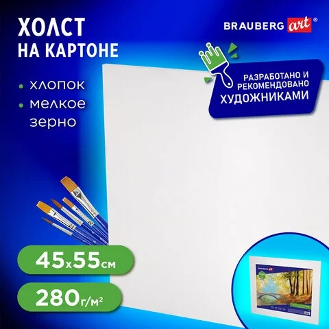 Холст грунтованный Brauberg на картоне, 45х55см, 280 г/м2, хлопок, мелкое зерно