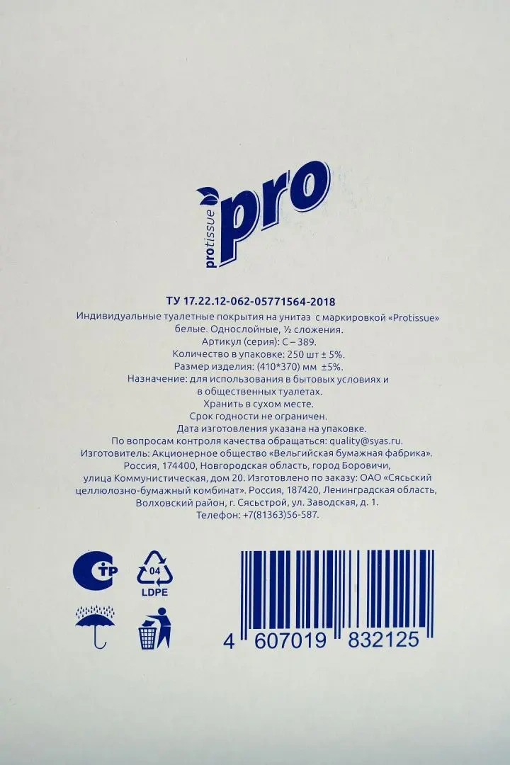 Индивидуальные покрытия на унитаз Protissue С389 белые, 250шт