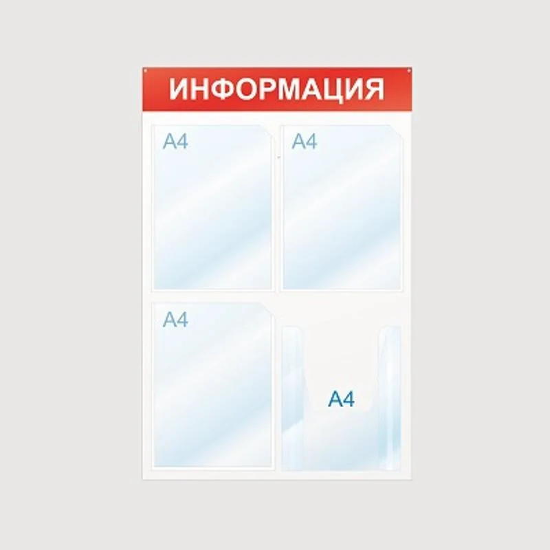 Информационный настенный стенд Attache «Информация» предназначен для размещения материалов на трех листах формата А4, а также брошюры формата А4 в вертикальном положении. Изготовлен из пластика белого цвета толщиной 4 мм. 3 плоских кармана — прозрачный пластик толщиной 0,5 мм, 1 объемный карман глубиной 33 мм — акрил толщиной 2 мм. Аппликация букв сделана красной пленкой. В комплекте со стендами идут: — саморезы — 2 шт. — наклейка-заглушка для саморезов — 2 шт.