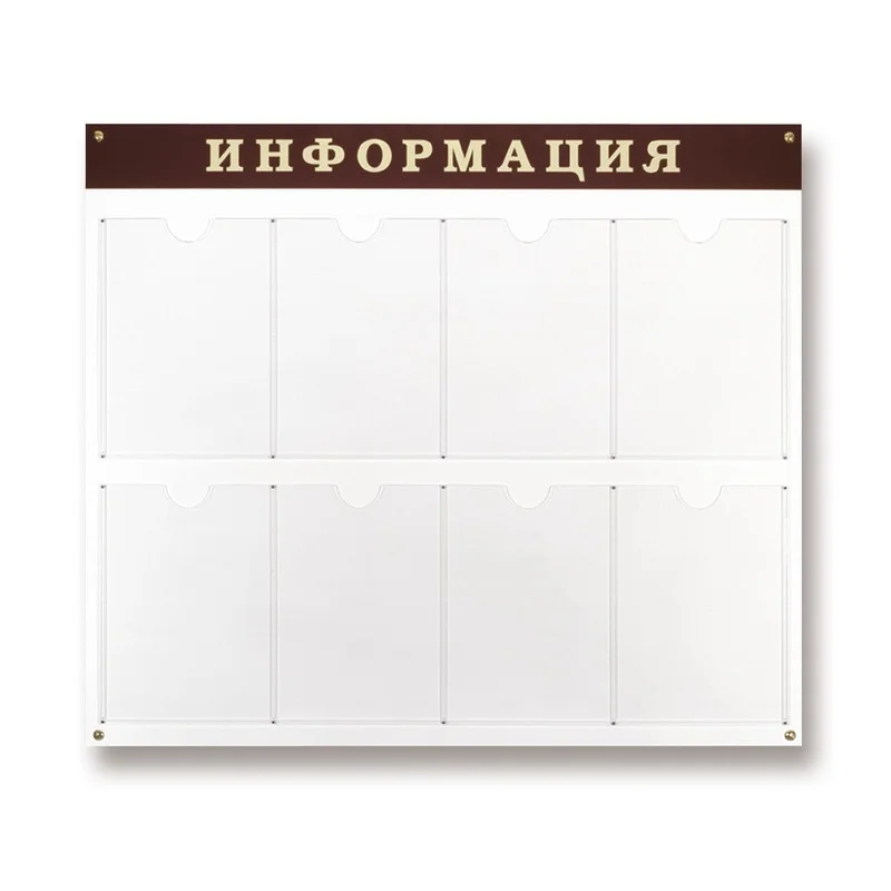 Информационный настенный стенд Attache «Информация» предназначен для размещения материалов на восьми листах формата А4 в вертикальном положении. Изготовлен из пластика белого цвета толщиной 6 мм. Карманы выполнены из прозрачного пластика. «Шапка» сделана из акрила темно-вишневого цвета, буквы — золотистые зеркальные. Стенд укомплектован необходимым крепежом.