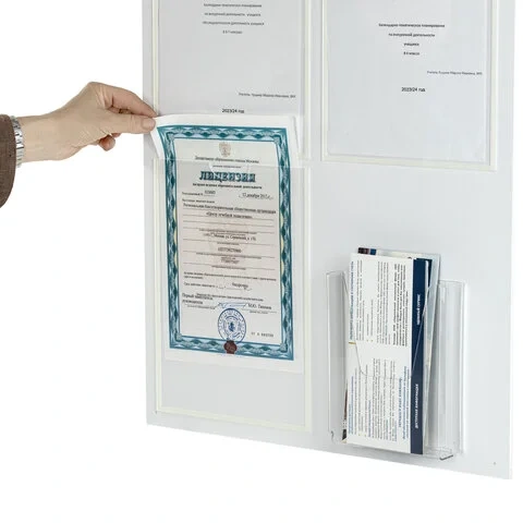 Размер доски - 52х78 см. Имеет 3 плоских кармана формата А4 из ПЭТ и 1 объёмный карман формата А5 из акрила. Материал основания - белый вспененный ПВХ. Поставляется с элементами крепежа в комплекте. Вес - 2,9 кг.