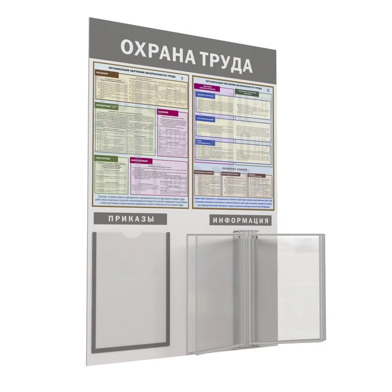 Информационный настенный стенд «Охрана труда» имеет основу из пластика. Размеры стенда — 950×625 мм. Является настенным. На стенде размещен карман формата А4 и 5 демопанелей.