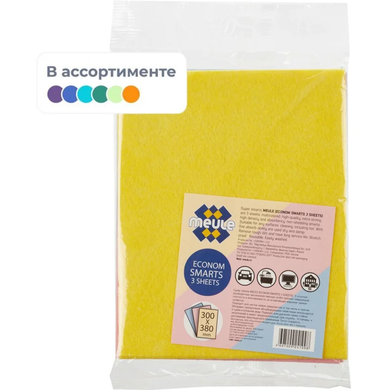 Салфетка хозяйственная Meule Econom Smarts универсальная, 38x30см, вискоза, ассорти, 3шт/уп