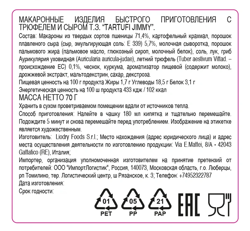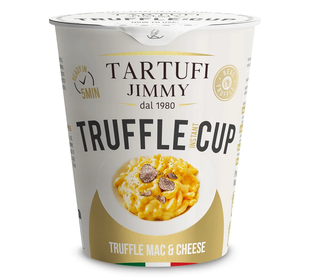 Встречайте инновационный продукт Tartufi Jimmy Truffle Cup быстрого приготовления. Готовое к употреблению блюдо для тех, кто не хочет отказываться от изысканных блюд, даже на работе, в тренажерном зале, в парке или где бы вы ни решили перекусить на ходу - это Mac&Cheese с трюфелем. Нежный сырный вкус пасты Mac&Cheese дополнен настоящим черным трюфелем. Макаронные изделия темного цвета, со вкусом и ароматом, характерным для трюфеля. Медленная сушка при низкой температуре данного продукта позволяет компонентам сохранить свой оригинальный вкус и аромат.