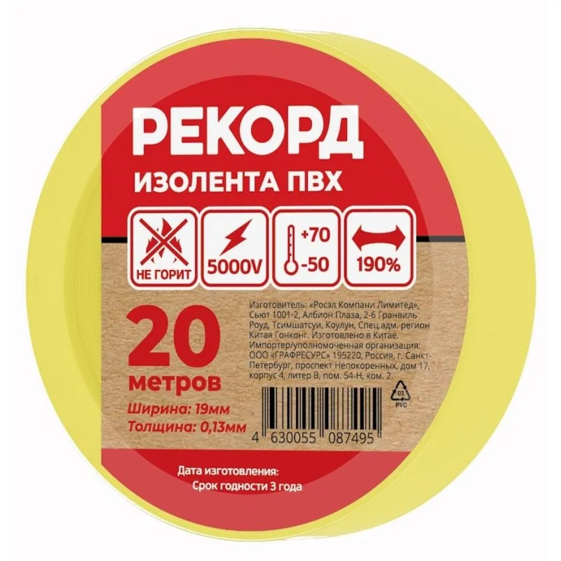 Изолента Рекорд ПВХ 19 мм x 20 м желтаяРазработана и изготовлена на основе пленки из поливинилхлоридного изоляционного пластиката, используемой в производстве профессиональных изоляционных лент. Специальные добавки, входящие в состав данного материала, повышают эластичные свойства ленты, увеличивают ее долговечность и обеспечивают устойчивость к горению.Допускается применение при температуре от -50 до 70 °С.Удлинение до разрыва: не менее 190%.Рабочее напряжение: 5000 В Ширина: 19 мм.Длина: 20 м.Толщина: 130 мкмЦвет: желтыйВнешний вид и/или характеристики товара могут быть изменены производителем в соответствии с производственным процессом.