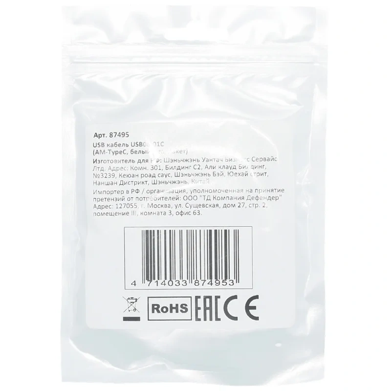 Кабель Defender USB08-01C USB(AM) - C Type, 2.1A output, 1m, белый