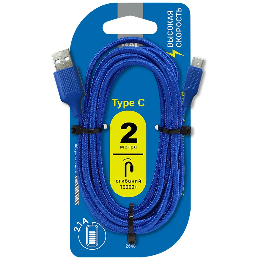 Кабель GAL 2648 USB— Type C 2А нейлон, 2 м позволяет подключать устройства с разъемом Тype-C к порту USB на компьютере для синхронизации и подзарядки либо к адаптеру питания с USB для удобной подзарядки. Кабель изготовлен из бескислородной меди в надежной изоляции. Контакты разъемов сделаны из материалов с высокими антикоррозийными свойствами. Нейлоновая оплетка обеспечивает дополнительную износостойкость кабеля. Жилы питания имеют увеличенный диаметр — 22AWG (0,5 мм), что позволяет быстро заряжать смартфоны и планшеты током до 2 ампер.