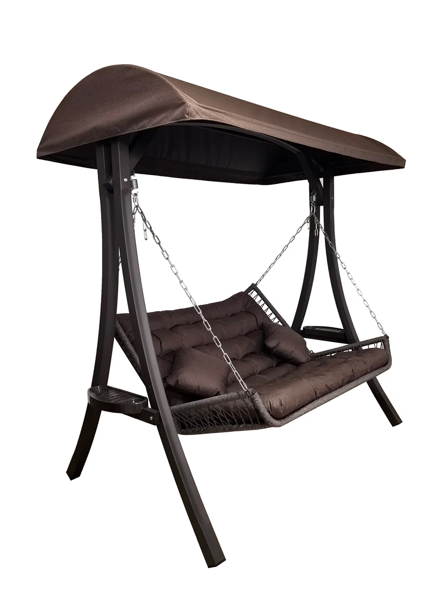 Прекрасно подойдут для лаконичного декора придомовой территории – в них нет лишних деталей, но каждая часть конструкции из стали продумана и функциональна. Заказать качели можно напрямую у производителя компании Удачная мебель с гарантией качества. Предприятие уже много лет занимается разработкой мебельной продукции, контролируя процесс производства от начала и до конца. Трехместная модель. Угол наклона спинки регулируется пошагово, при этом качели можно разложить полностью на 180 градусов. Основой сиденья служит качественная оцинкованная сетка, которая не боится влаги и эластична. Диван-качели Аккра максимальная нагрузка 120кг.