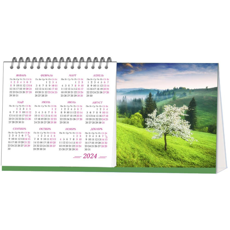 Календарь-домик настольный 2024,190х100,Пейзаж,1спир,12л.офсет 80 г.22с14-3 Общий размер календаря 190x100 мм, материал блока - офсет 80 гр., двухкрасочная печать, 14 листов (12 л. блок + 2 л. календари) размера 105x95 мм, подставка - мелованный картон 300 г/кв м, полноцветная печать, металлический гребень сверху, отдельные листы с календарем на два года.