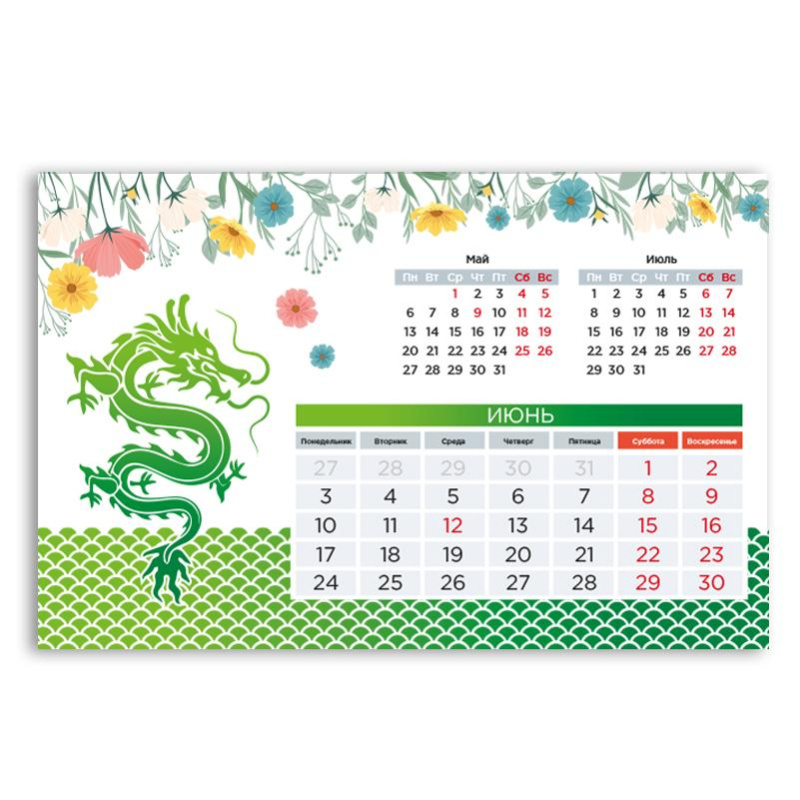 Календарь-домик настольный Символ года. Дракон, 2024, 230x150 Календарь настольный типа 'домик' на 2024 год 'Символ года. Дракон' будет украшением Вашего стола. Состоит из 7 листов текста (месяцы+ обложка) и подставки, которые крепятся между собой спиралью. Формат в собранном виде 230x150 мм. На подставке сделаны 3 биговки для ее установки на столе. Каждая страница соответствует 1 месяцу и имеет цветную картинку. Блок - мелованная бумага плотностью 115 г/м2, подставка мелованный картон плотностью 295 г/м2. Выходные и праздники выделены красным цветом.