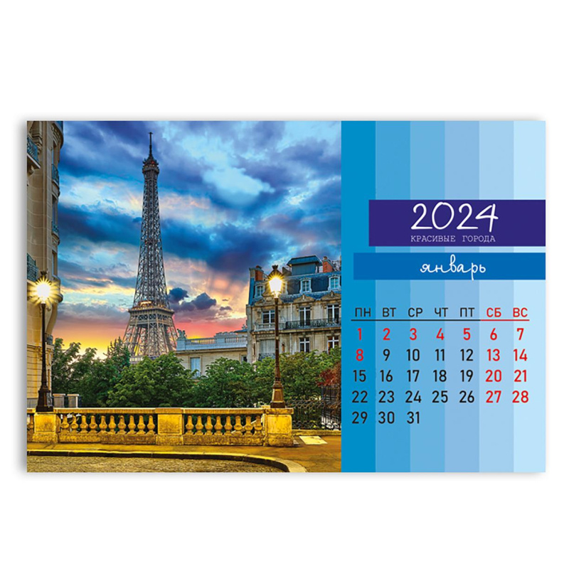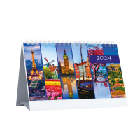 Календарь-домик настольный Красивые города, 2024, 210x150 Календарь настольный типа 'домик' на 2024 год 'Красивые города' будет украшением Вашего стола. Состоит из 7 листов текста (месяцы обложка) и подставки, которые крепятся между собой спиралью. Формат в собранном виде 210x150 мм. На подставке сделаны 3 биговки для ее установки на столе. Каждая страница соответствует 1 месяцу и имеет цветную видовую картинку разных городов Мира. Блок - мелованная бумага плотностью 150 г/кв.м, подставка мелованный картон плотностью 270 г/кв.м. Выходные и праздники выделены красным цветом.