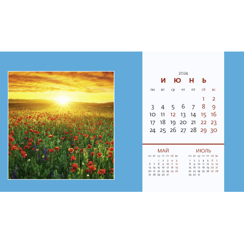Календарь-домик настольный шалашик на 2024 год Родные просторы Настольный календарь 200х115 мм, 12 листов + 2 обложки, мелованная бумага, разрезная сетка, курсор, пружина, подложка: мелованный картон, место для рекламы 200х25 мм. Пейзажи российской природы.