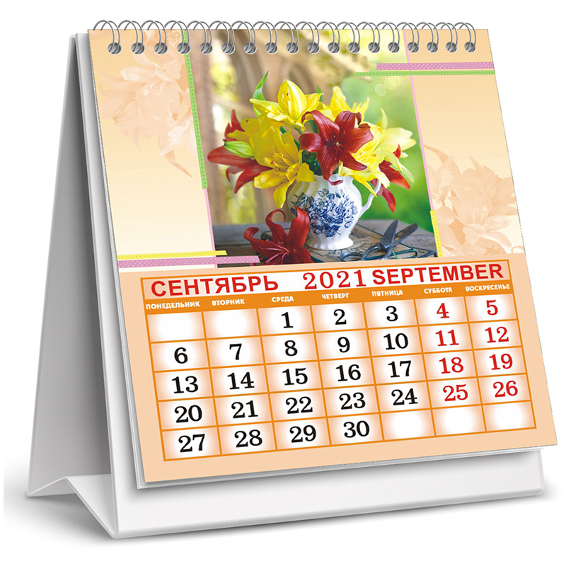 Настольный календарь-домик на 2021 год станет незаменимым помощником в планировании рабочего дня.Размер календаря – 98?140 мм. 7 листов. Календарная сетка на 1 месяц.Блок:• Материал – мелованная бумага, 90 г/м2.• Цветность – полноцветная печать.• Кол-во гребней – 1.Подложка – однотонный мелованный картон.