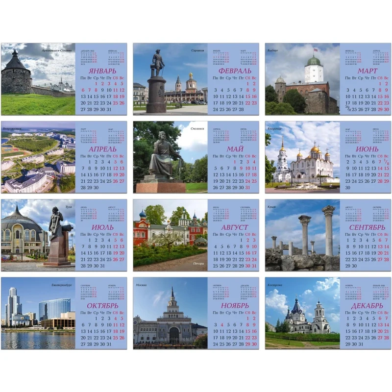Общий размер календаря-домика настольного ?Города России? 210x120 мм. Материал блока- мелованная бумага 115 гр., полноцветная печать. Блок содержит 14 листов (1 л. обложка + 12 л. блок + 1 л. календарь). Подставка-мелованный картон 300 г/кв.м, полноцветная печать. Календарь скреплен металлическим гребнем сверху.