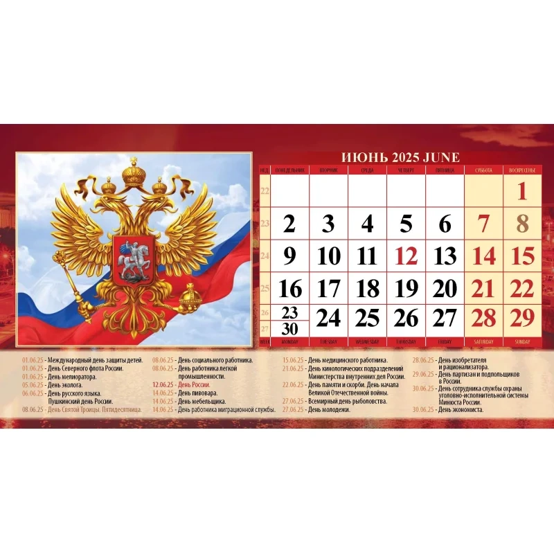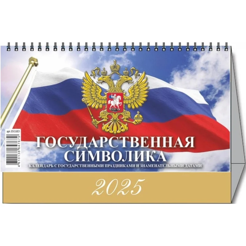 Календарь-домик настольный 2025,Гос.символ.С гос.праз,1спир,200х140,0925013 Настольный перекидной календарь-домик на 2025 год на металлическом гребне, формат 200х140 мм. Состоит из подставки (тонированный золотым пантоном мелованный картон плотностью 250 г/кв.м) и семи листов мелованной глянцевой бумаги плотностью 105 г/кв.м, скрепленных металлическим гребнем. Первый лист - красочная обложка, внутренний блок - шесть двусторонних листов со слайдами и календарными сетками на каждый месяц с нумерацией недель. В календаре обозначены государственные праздники и знаменательные даты.