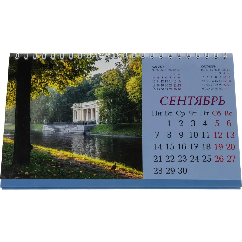 Настольный перекидной календарь-домик на 2026 год на металлическом гребне, формат 210×120 мм. Состоит из подставки из мелованного картона плотностью 300 г/кв.м и 14 листов мелованной глянцевой бумаги плотностью 115 г/кв.м, скреплённых металлическим гребнем.